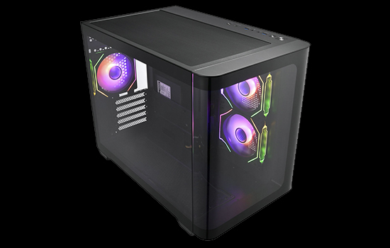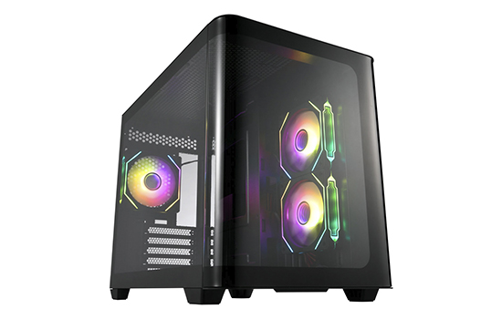 A lateral conta com 2 ventoinhas ARGB silenciosas reversas de 120mm, enquanto a parte traseira é equipada com um ventilador ARGB de 120mm.