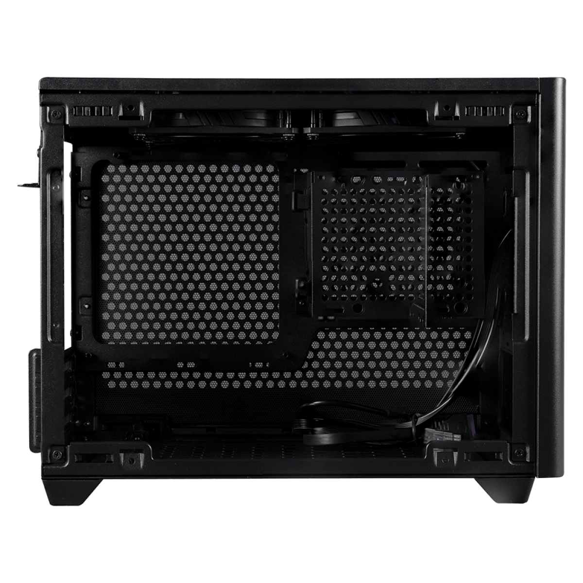 Compatível com Mini-ITX e Mini DTX. A PSU pode ser montada frontalmente para espaço extra da placa-mãe com um espaço máximo de 244 x 226 mm.