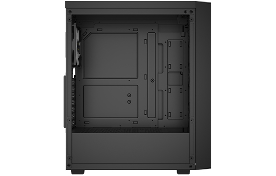 O gabinete compacto mid-tower suporta a instalação de GPUs de até 300 mm de comprimento, um design de cobertura de PSU e uma profundidade com amplo espaço para otimização do gerenciamento de cabos.