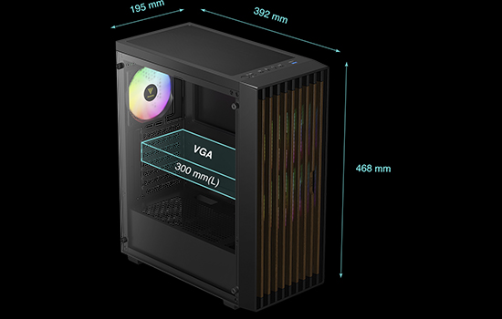 - Suporte para GPUs de até 300 mm e coolers de CPU de até 160 mm.