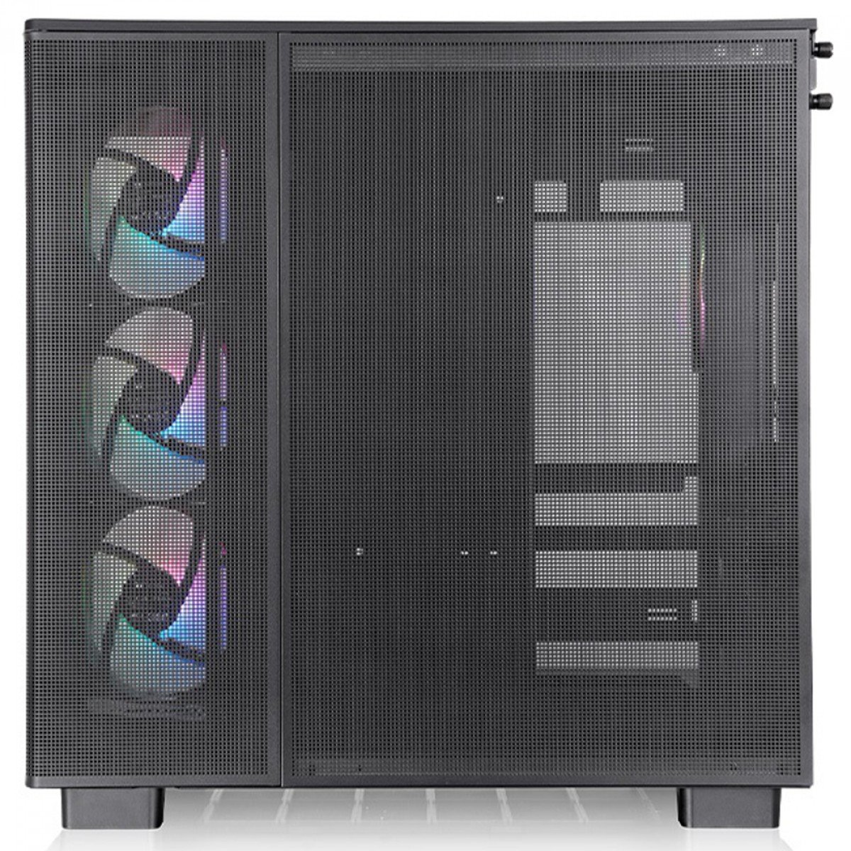 O gabinete View 380 XL TG ARGB Mid Tower é um gabinete ATX de câmara dupla com suporte para placa-mãe com conector oculto, quatro ventoinhas ARGB Lite com rolamento hidráulico de 120 mm e espaço para um radiador de 360 mm na parte superior e na lateral da placa-mãe.