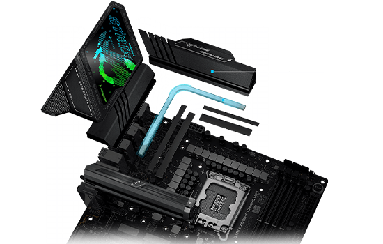 Dois dissipadores de calor espessos cobrindo a seção de fornecimento de energia fornecem canais de fluxo de ar estratégicos para maior dissipação de calor, ao mesmo tempo em que capacitam processadores Intel® Core™ Ultra de alto desempenho (Série 2)