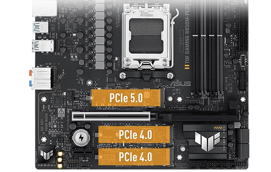 Esta placa-mãe também possui um slot M.2 PCIe 5.0 para aproveitar as transferências de dados mais rápidas, de até 128 Gbps*, e todos os slots M.2 suportam configurações NVMe RAID para aproveitar as velocidades mais recentes disponíveis.